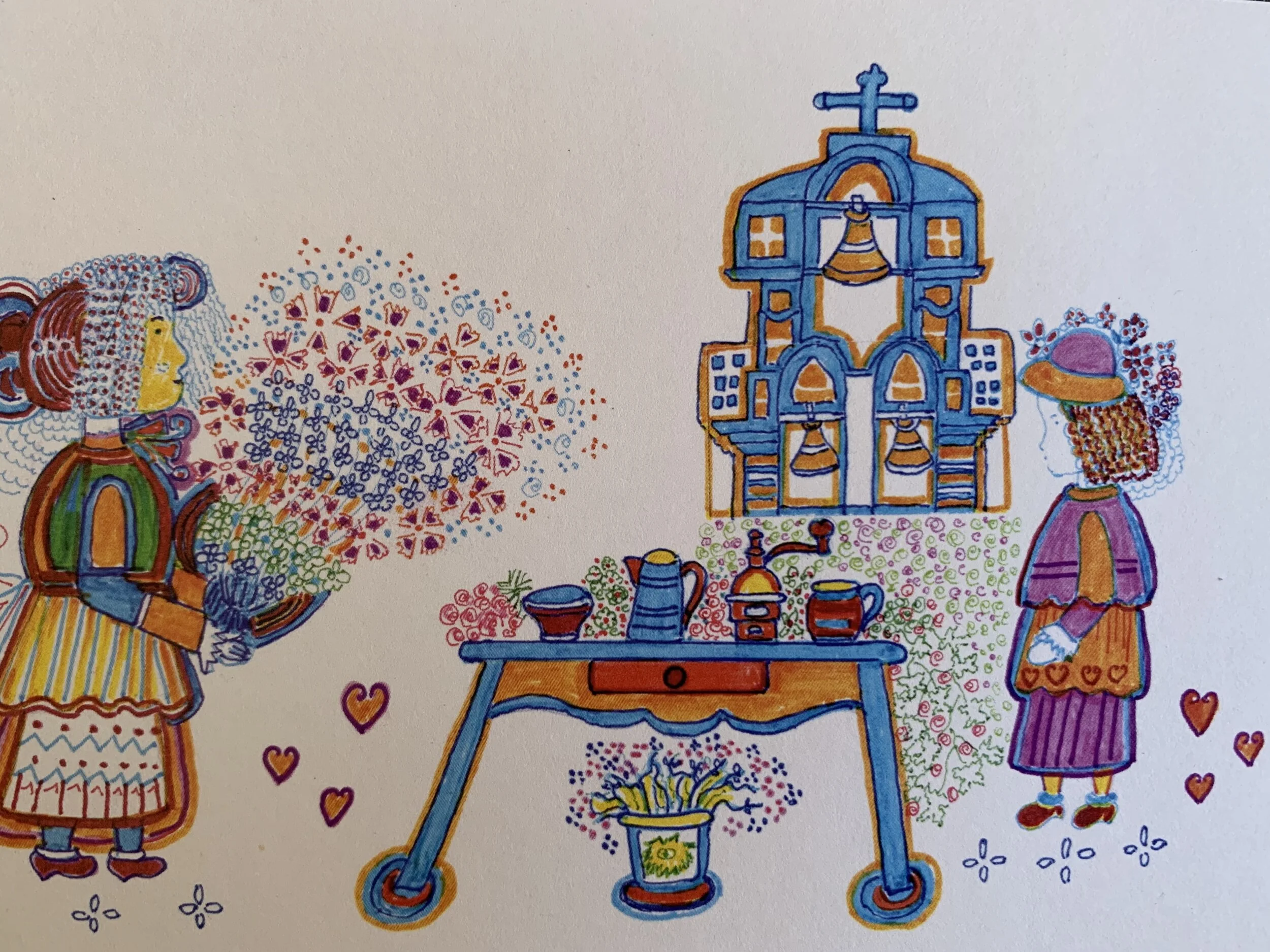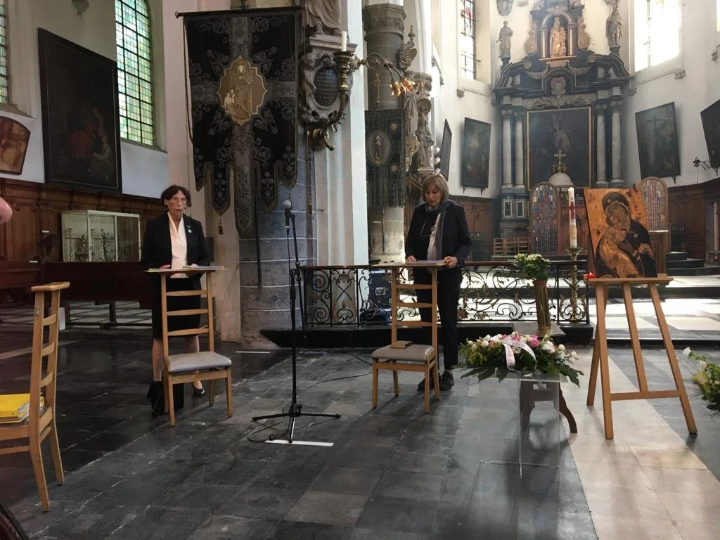 Tekening van Lut De Henau en foto’s van de ingetogen dienst in de St. Elisabethkerk in het Begijnhof (wegens Corona - tijd)