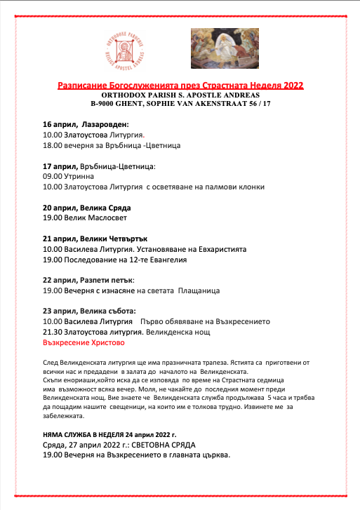 Разписание Богослуженията през Страстната Неделя 2022 Orthodoxekerk Gent13 april 2022 Facebook0 Twitter 0 Likes