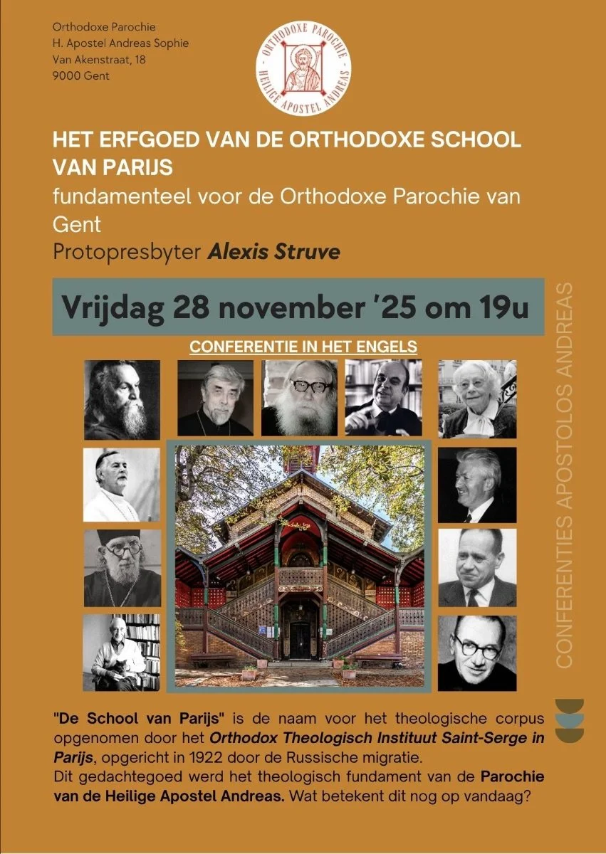 "Het erfgoed van de orthodoxe school van Parijs", fundamenteel voor de Orthodoxe Parochie van Gent. VRIJDAG 28 november om 19u Protopresbyter Alexis STRUVE Bisschoppelijk Vicaris te Parijs (Le Vicariat) Conferentie: spreektaal Engels Van harte welkom!