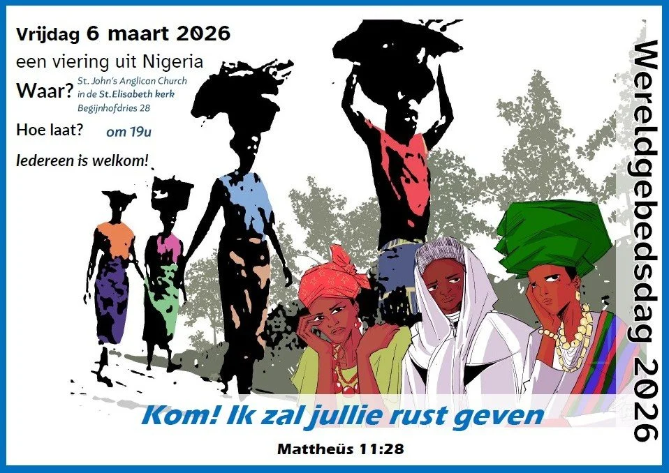 Vrijdag 6 maart is het namelijk weer zover: de internationale wereldgebedsdag met in Gent een viering die start om 19u. We zijn te gast bij de Anglicaanse St. John's kerk in de St-Elisabethkerk, Begijnhofdries 28. Zie ook de affiche in bijlage. U bent van harte uitgenodigd. Rev. Evelyn Sweerts zal de overdenking verzorgen.